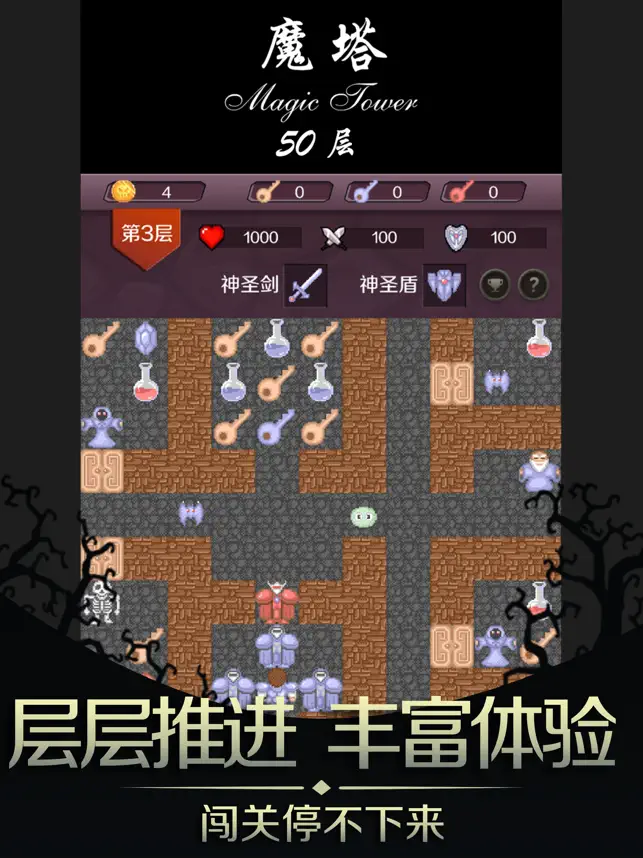 魔塔是一款十分经典的游戏,身为勇士的你必须闯过一层又一层的魔塔,最后到达塔顶救回你那美丽的公主,魔塔里到处都充满着凶残的怪物,我们必须杀死他们而换来美好的和平。