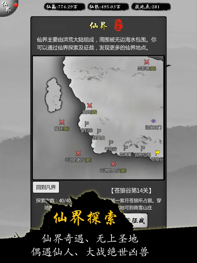 6、仙界地图。探索仙界、偶遇仙人、进入无上圣地、大战绝世妖兽