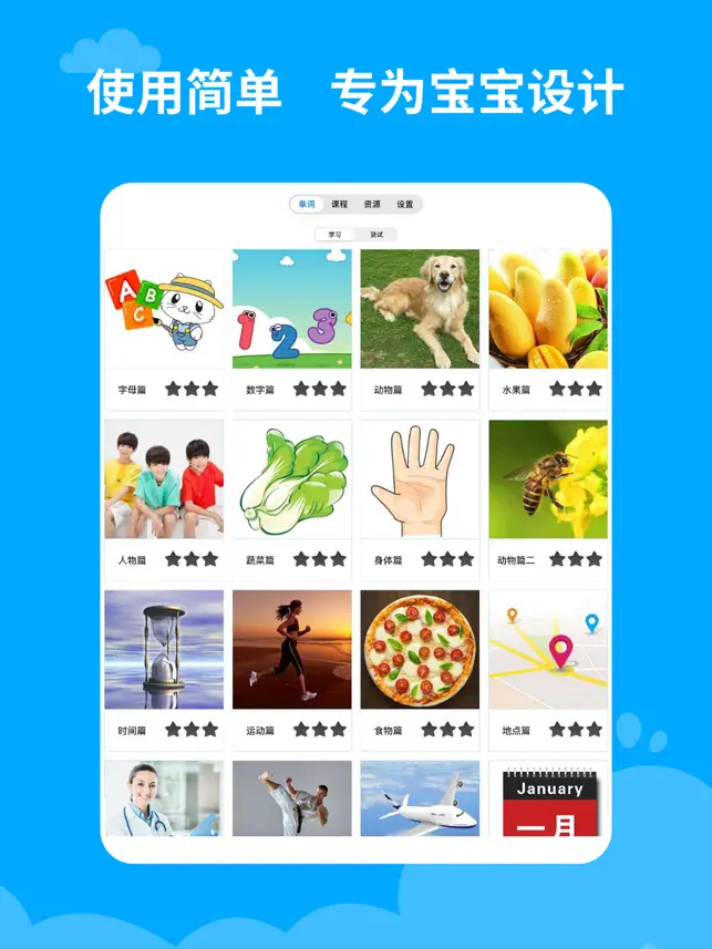 《宝宝学英语》是由成都爱识字信息技术有限公司的团队专为学龄前的宝宝设计的一款手机软件,用于帮助宝宝学习常见的英语单词。目前收录共28个大类常见英语词汇,所有资源全部免费。其中包含基础的字母,数字等简单内容,也有常见的动物,水果,蔬菜,运动等进阶课程,更有身体,月份,交通等高级课程,能够适应不同年龄小朋友的学习需求。本软件所有发音均为真人语音,真实的插图配以有趣的内容,让孩子们能够牢记常见单词及读音的同时又能认识世界。无需联网,无需任何数据包的下载,打开就能随时随地的学习。