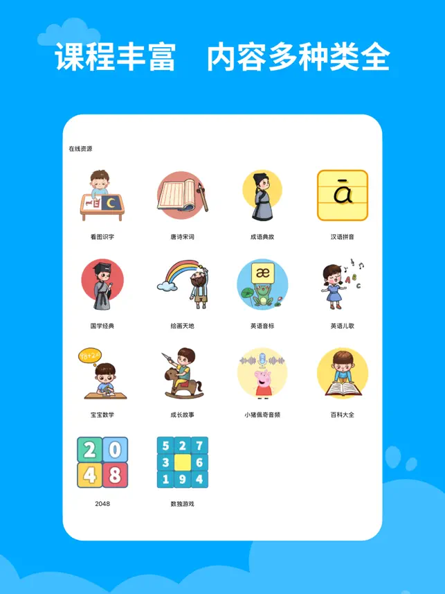 5. 资源丰富,儿歌,唐诗,故事,拼音,识字应有尽有